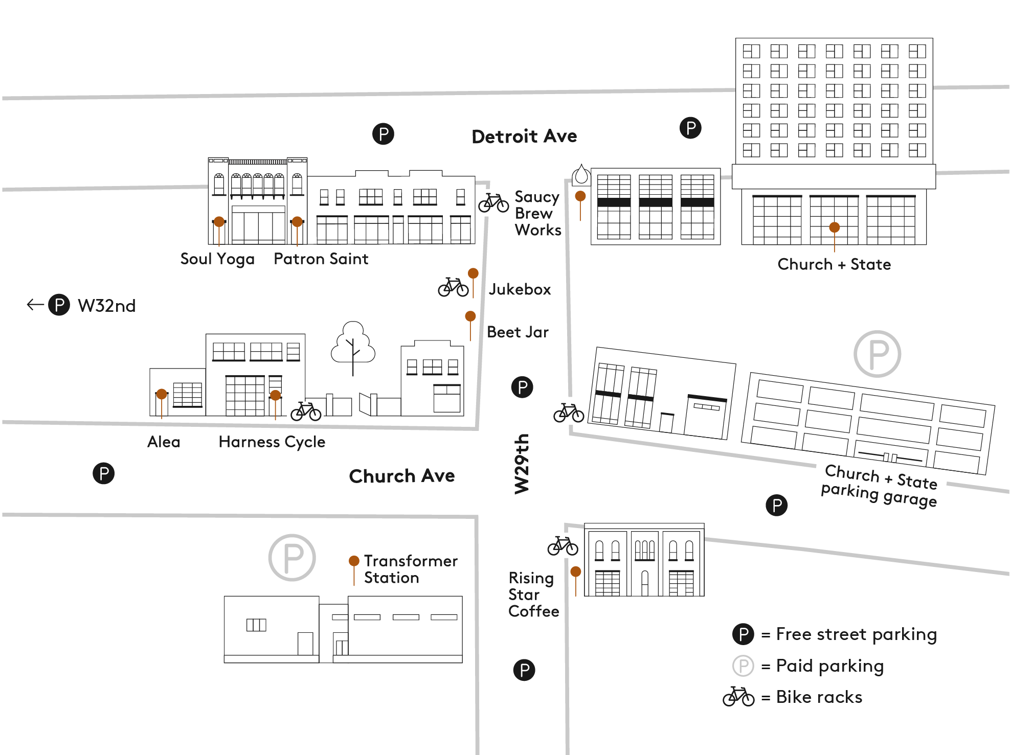 While we strongly encourage walking, biking, and public transit. Paid parking is available at the Church + State Parking Garage and Transformer Station lot